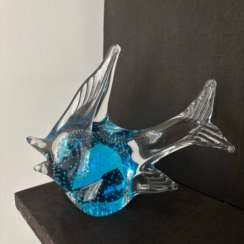 Fisk nr 1 måler er fra Bergdala Sweden ca 7 x 9 cm har en fin form med en buet rygfinne og hale begge med riller, den har øjne og mund, meget flot stand