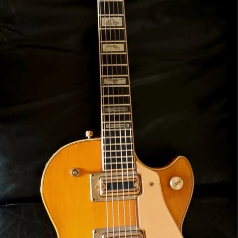 Key features of the Gretsch 6120 Chet Atkins model include a hollow body with a single-cutaway design, a Bigsby vibrato tailpiece, and a distinctive Western-themed appearance, often featuring a Western Orange finish. The guitar sounds fantastic and has an easy playing neck with a low action. Thanks to Gretsch’s famous Filter’Tron humbucking pickups, which deliver a clear, articulate tone with a perfect blend of warmth and bite. These pickups are prized for their ability to cut through a mix without losing their smoothness. The guitar has newer Gretsch turners and a small repair was made on the headstock and pretty hard to see. This 6120 model is known for its warm, twangy tone, making it suitable for various genres, including country, rockabilly, and rock ‘n’ roll. This guitar is almost all original and comes with original Gretsch hardcase.