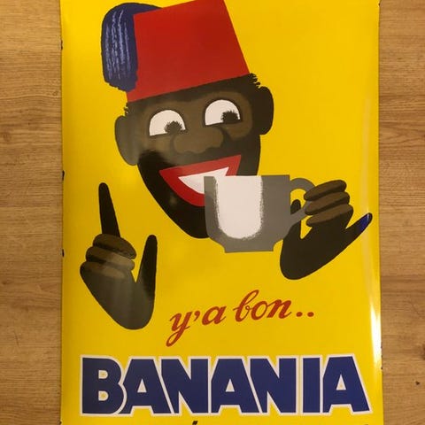 Den originale reklame inkluderede en sort soldat (tirailleur) med sloganet "Y'a bon Banania", hvilket blev kritiseret for at fremstille en racistisk stereotyp og antyde sproglig underlegenhed.