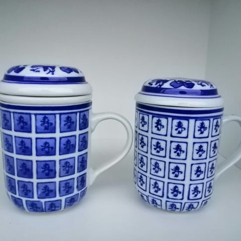 Fint tysk krus til te/urtete med låg og tesi. Har aldrig været brugt. Rart hvis man kun skal lave en kop te. Låget holder teen varm.