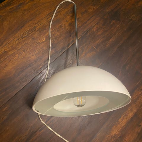 Pendel, Herstal, Fin lampe brugt over spisebord fra Herstal. Diameter er 38 cm. Med 90 cm klar ledning og lang forkromet balance/styrepind. Bruger elpære med stor sokkel/E27. Med glasbundplade så lyset ikke irriterer hvis lampen monteres højt. Fin og funktionel stand.