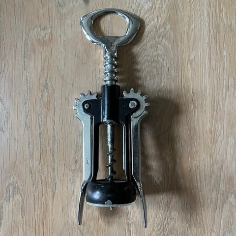 Skær folien af med kniven. Pump luft i flasken og proppen glider op. Nemmere bliver det ikke