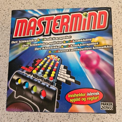 Mastermind brætspil med sort æske og ikonisk coverbillede. Spillet er designet til at udfordre logisk tænkning og problemløsning. Egnet til flere spillere og kan bruges til underholdning og træning af analytiske evner. Sender ikke for køb under 200 kr.
