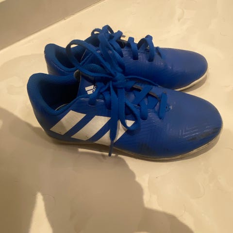 Adidas unisex indendørs fodbold sko i størrelse 31 med blå og pink farver. Skoene har snørebånd og gummisål med mønster for bedre greb. Materialet er tekstil og syntetisk, velegnet til daglig brug.