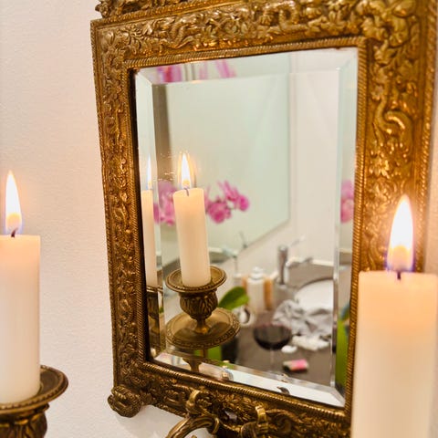 Messing ornamentik, facet spejle og træ med metal på bagsiden.