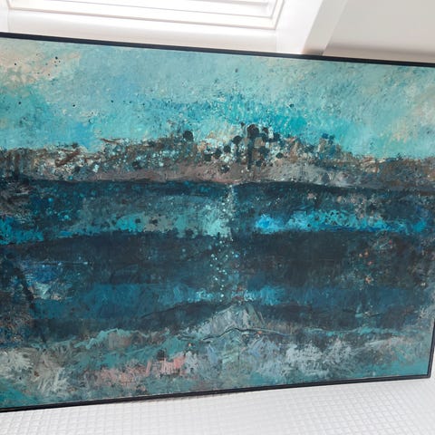 Vintage oliemaleri på lærred indrammet i lys grå/mintgrøn vintage træramme. Landskapsmotiv. .Maleriet er signeret 'Holger 47'. Rammemål: 43 x 34 cm.. / motivmål: 31 x 22 cm.