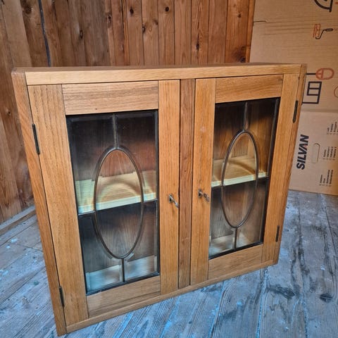 Vintage egetræs vægskab med to glaslåger og dekorative udskæringer. Skabet har en buet top og en hylde indvendig. Materialet er træ med naturlig finish, og skabet er designet til ophængning på væg. Velegnet til opbevaring af små genstande eller som dekorativt møbel.