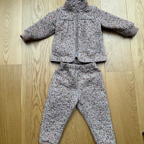 Termosæt fra wheat i str 92. Jakken i fin stand med enkelt mærke nederst til højre. Bukser med få mærker og et lille hul.