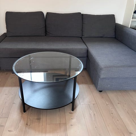 Jeg sælger denne sove sofa for skal flytte og bordet følger med til. For de hænger sammen det er en sort sofa med en lille rød plet på den ekstra delen du trækker ud af sofaen så ja skriv hvis du har nogen spørgsmål