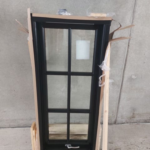 Topstyret vindue i træ med 2-lags energirude. Der er monteret paskvilgreb