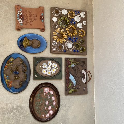 Fint keramikrelief med svensk motiv: måger, hus, bådebro, båd, strandskaller m.m. Dejlige lyse farver. Sign.: SF01