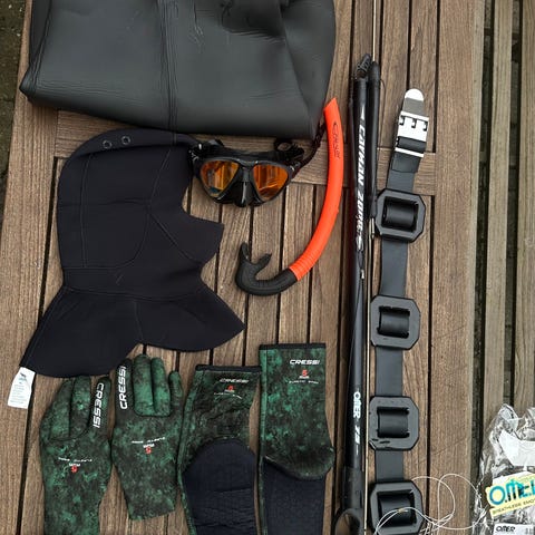 Sælger her en undervandsjagt taske fra det nordiske mærke scorpena, der er plads til 90 cm lange finner nede i tasken og alt tænkeligt grej + mere, harpunerne kan klikkes på i siderne