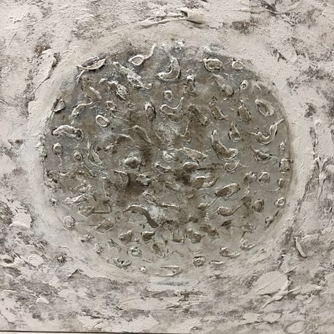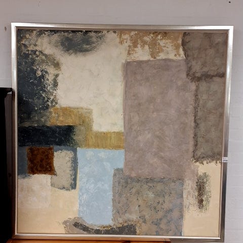 Kunstværket har abstrakte former i forskellige nuancer, kombineret med tydelig tekst.