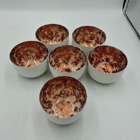 Sættet består af seks skåle med en hvid yderside og en glitrende kobberinderside. Glat overflade. Tåler ikke vand. ,Afhentes i:,Røde Kors Egå (751),Bemærk at mail, chat og beskeder ikke besvares, og varen skal købes på knappen "Gå til varen"