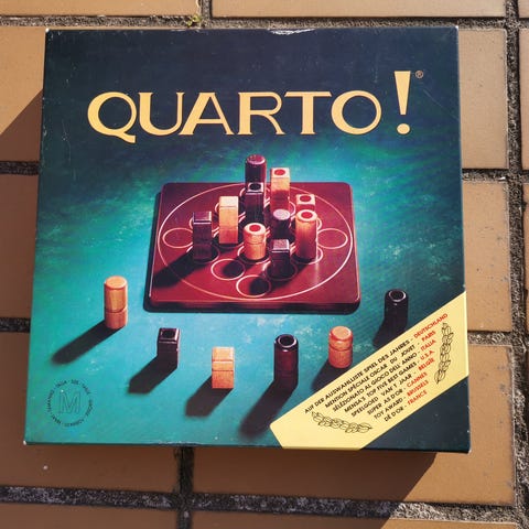 Quarto! Brætspil med firkantet spillebræt og 16 forskellige spillebrikker i træ. Spillet går ud på at få fire ens træk i træk enten i farve, højde, form eller fyld. Velegnet til to spillere og kan bruges til strategisk tænkning og underholdning. Komplet. Sender ikke for køb under 200 kr.