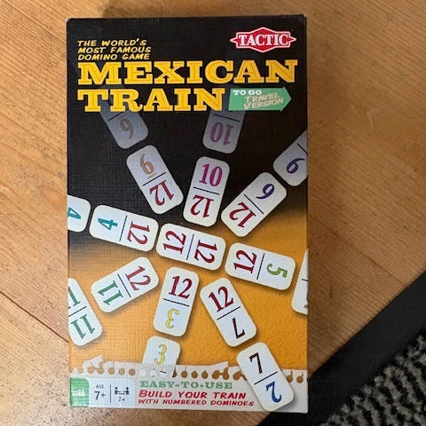 Original Mexican Train brætspil med tog og dominobrikker. Spillet indeholder togfigurer og dominobrikker til flere spillere. Velegnet til familiespil og sociale sammenkomster. Komplet. Sender ikke for køb under 200 kr.