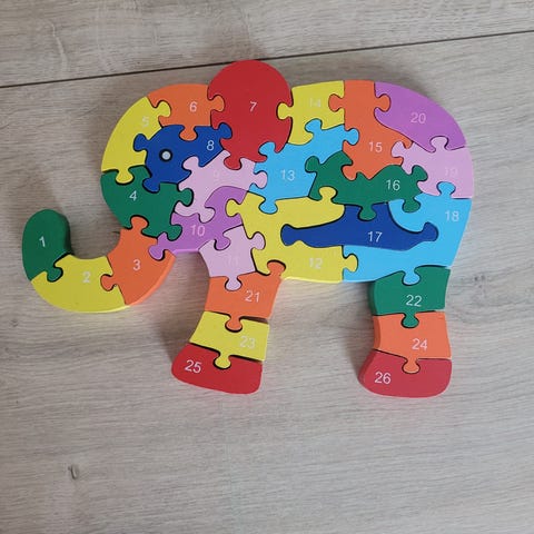 Et puslespil til den lille begynder; bare 4 brikker. Minder mig lidt om en elefant fra Benneweis 🫶 Fint er det. Også bare til pynt. Limklat på bagsiden. Slidt i kanterne og der har også været en løbsk tusch forbi på pladen under brikkerne. 37,5 x 31,4 cm.