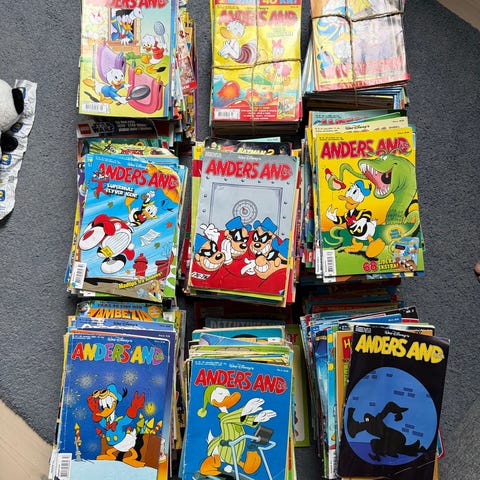 Anders And tegneserieblade i en blandet samling med over 300 eksemplarer. Nypris over 12.000 kroner. Serien indeholder også specielle numre og udgaver, velegnet til samlere eller læsere af klassiske tegneserier.