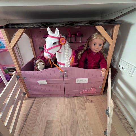 legetøjsstald med plads til hest og tilbehør. Indeholder en stor hvid hest med pink sadel og grime, lille sort hest, samt forskelligt tilbehør som børster, spande, og redskaber. Stalden er lyserød med brune detaljer og har flere rum til opbevaring og leg. Egnet til børn til rolleleg og udvikling af fantasi.