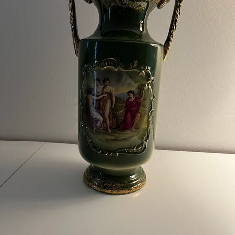 Retro fra 1975 keramik vase i beige med håndmalet blomstermotiv i farverne pink, grøn og blå. Vasen har en rund form med en bred åbning og en let rustik overfladestruktur. Velegnet som dekorativ genstand i hjemmet. Hullet i vasen måler i diameter 11,5 cm højden er 26 cm