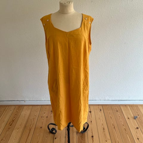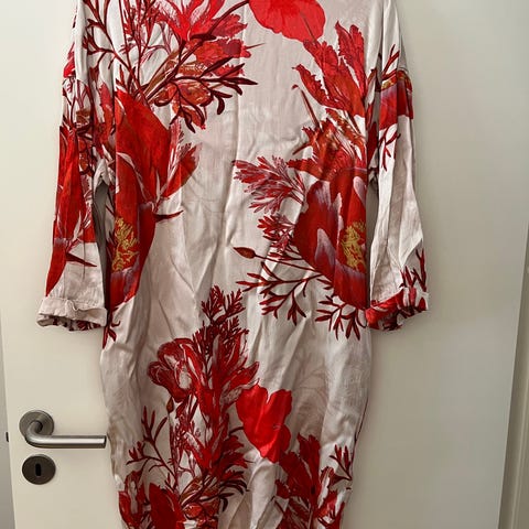 Kjolen måler 2 x 51 cm over brystet. Den er ca 87 cm lang. 3/4 ærmer. Lille kinakrave. Polyester og elastan. Made by Andersen.