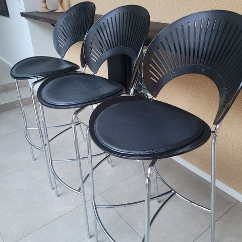 Nanna Ditzel Trinidad, 2 barstole i sort med børste stel, sædehøjde 76 cm, der er nogle synlige brugsspor i ryglænet på begge stole, se billede. Enkeltvis 2000,. eller samlet for 3500.-
