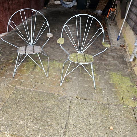 Sæt bestående af 2 metalstole i lyseblå farve designet til både indendørs og udendørs brug. Stolene har en buet, gyngende ramme og et sæde samt ryg med vandrette lameller.
