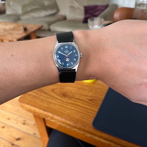 Uret er i god stand og har kun få ridser i glasset. Uret kommer på en flexlænke