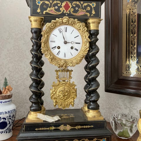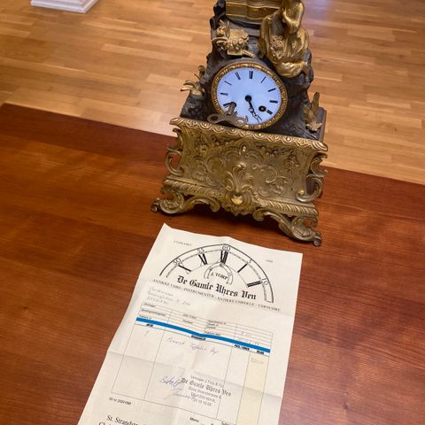 Antik bordur i guld med detaljerede figurer og dekorative elementer. Fransk taffelur lueforgyldning i god stand. Flot med dame og kors. Uret har en rund urskive med sorte romertal og er i emalje. Konsoluret er 45 cm højt og fra midt 1800 tallet. Uret er serviceret indenfor det sidste år da det har været en del af vores samling. Det går og slår fint