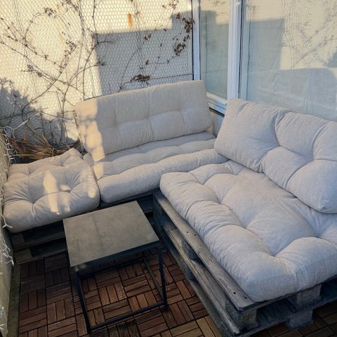 Stor havemadras/pallehynde/solmadras med 2 puder i lys grå.