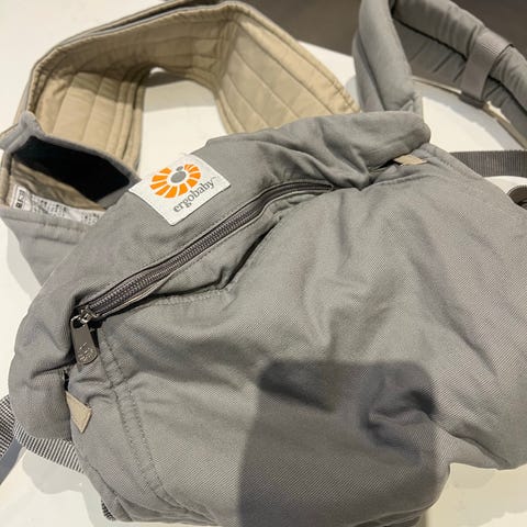 Ergobaby bæresele i grå farve med justerbare stropper og polstrede skulderremme. Designet til at bære spædbørn og småbørn med komfort og støtte. Materialet er holdbart og velegnet til daglig brug.