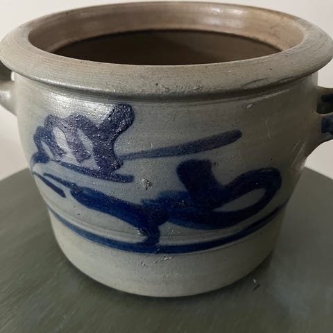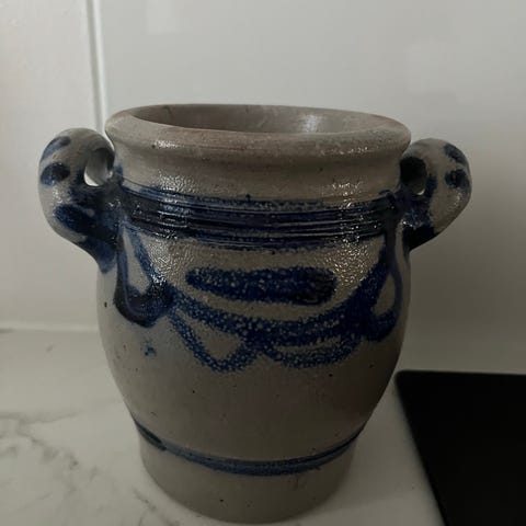 Krus lavet på samme måde som gamle syltekrukker. højde ca. 12 cm og diameter ca. 8 cm plus hank. Sælges i Hillerød