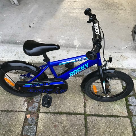 Blå børnecykel med 16 tommer hjul. God begynder-cykel. Hjælpe-stang som ses på fotos kan medfølge.