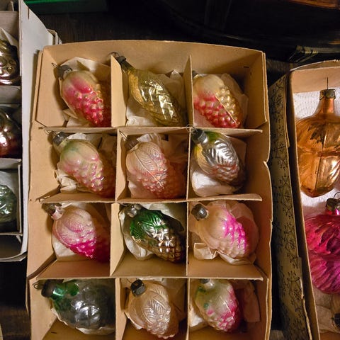 Juletræ kugler / julepynt af mundblæst og farvet glas i form af grankogle, fra det tidligere Sovjetunionen / USSR / Ukraine. For størrelse, se fotos. I pæn stand uden skår, dog med forventelig patinering da de har en del år på bagen.