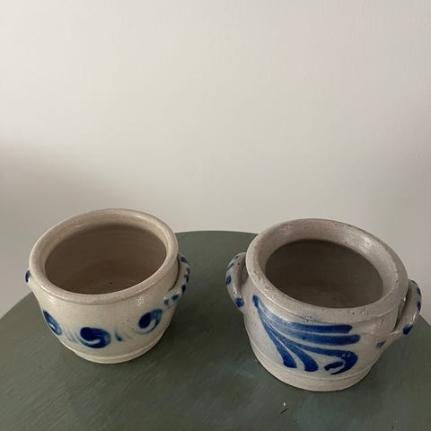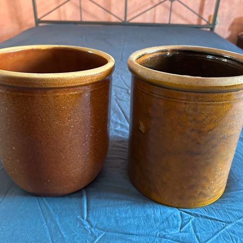 2 gamle syltekrukker hver krukke kan indeholde 1 liter. højde ca. 11 cm, diameter ca. 13,5 cm plus hanke. Sælges i Hillerød. Pr stk 90 kr. begge for 150 kr.