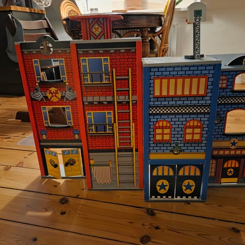 Legetøjs hospital i træ. Kan åbnes og leges med, med de tilhørende dele. En patient, en sygeplejerske, en læge, en ambulance, en puls måler og en seng.