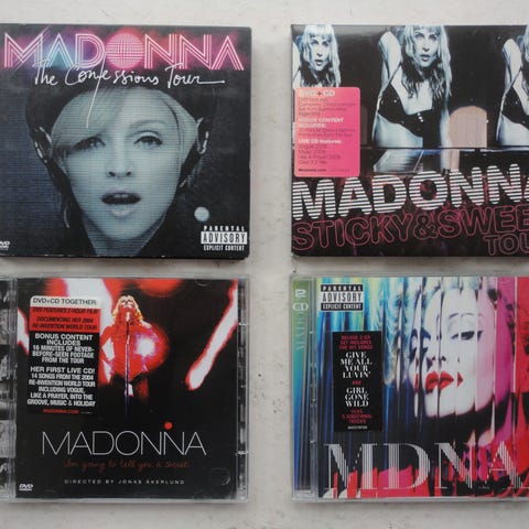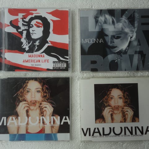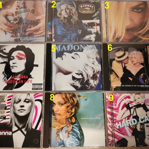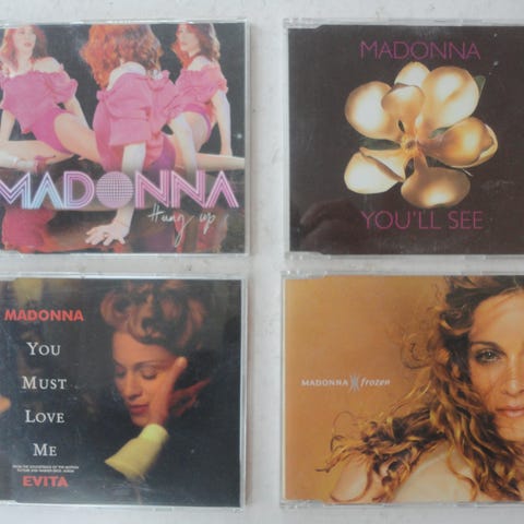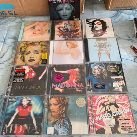 1: CD + DVD,. I`m going to tell You a secret. 2: 2 CDèr. Celebration. 3: True Blue. 4: Conssesion on a Dance floor. 5: Immaculate collection. 6: Ray of light. 7: Like a prayer. (uden cover) 8: CD singkle. I`m going to tel yoy a secret. samlet pris 60 kr.