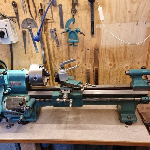 Kæmpe stor gammel drejebænk som trænger til lidt olie og en ny ledning. Den virker i alle funktioner, men trænger til lidt masage.