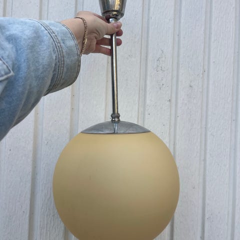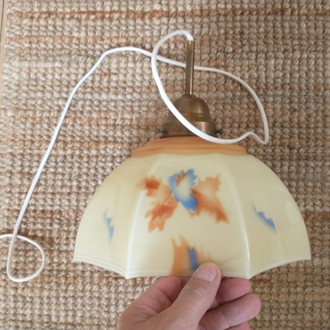 Sandfarvet paraplylampe fra 1940'erne. med blomster og messing ophæng. Den har lidt patina.
