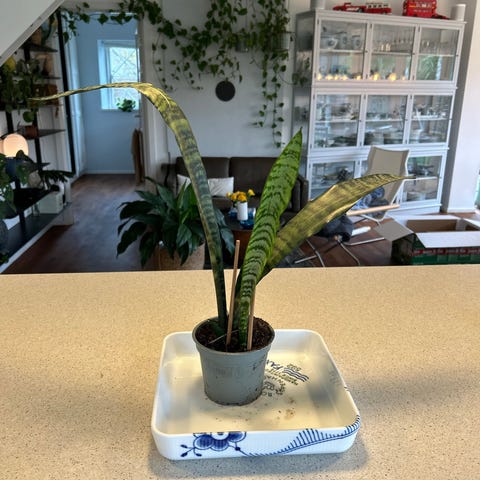 Sansevieria cylindrica stueplante med lange, cylindriske grønne blade. Planten er velegnet til indendørs brug og kræver minimal vedligeholdelse. Den er plantet i en brun terrakottapotte og kan bidrage til at forbedre luftkvaliteten i hjemmet. Underskål medfølger ikke