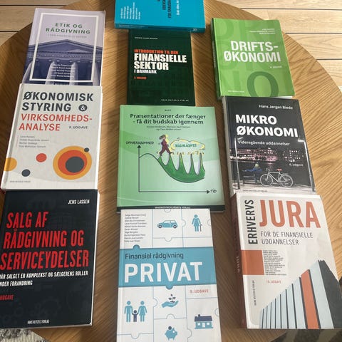 Sæt bestående af lærebøger inden for økonomi og handel. Indeholder titler om driftsøkonomi, økonomisk styring og virksomhedsanalys, personlig lederskab, privatøkonomi, international markedsføring, finansielle markeder og investering for private, interviewteknikker samt jura med fokus på erhvervsret. Bøgerne dækker emner som økonomisk teori, ledelsesprincipper, markedsføring, finansielle forhold og juridiske aspekter relevant for erhvervslivet.