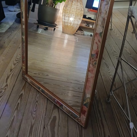 Facetslebet spejl i massiv træramme med malet blomster motiv. I fin stand.