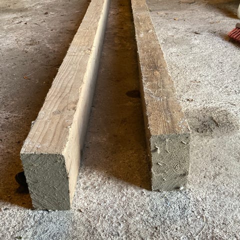 Jeg sælger to (2) styk tørre tømmer i dimensionen 9.5 cm× 9.5 cm og 270 cm i længden. behandlede træ.