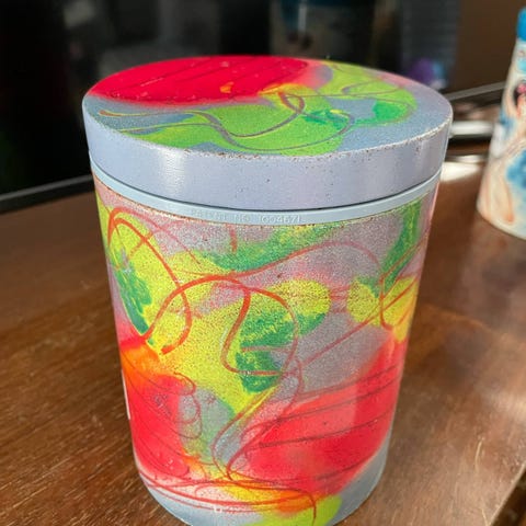 Irmadåse med motiv af den franske maler Jean Messagier, hvilket fremgår af etiketten i bunden.