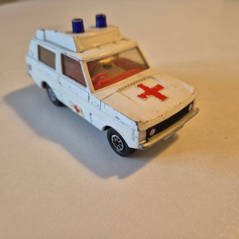 Legetøjsambulance i hvid med rødt kors på taget og siderne. Udstyret med blå sirener på taget og åbent bagagerum. Fremstillet i metal og plast.