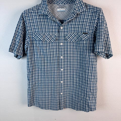 Skjorte, Columbia Omni-Shade Sun protection , str. M, grønternet, Polyester fabric, Næsten som ny, Lækker flot og elegant grøn skjorte fra Columbia med korte ærmer , Omni-Shade / UV Sun protection i dejligt køligt, praktisk og fugttransporterende materiale . Herrestr. M / medium har to brystlommer.