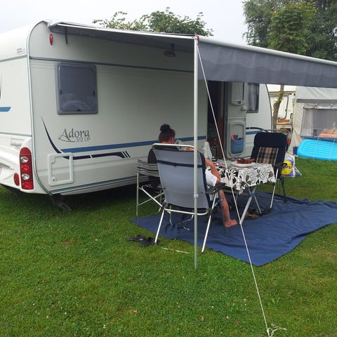 Fiamma posemarkise og sider med store vinduer til campingvogn.