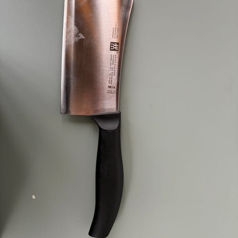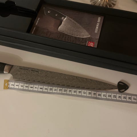 21cm japansk kokkekniv fra Zwilling i samarbejde med Bob Kramer. Sjældent udbudt i Danmark. Velholdt på endetræ skærebræt.