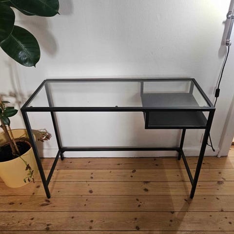 Fint og kompakt bord fra ikea i metal med glasplade. Det er brugt som midlertidigt skrivebord, og det har været ret praktiks ift. at gemme ledninger væk i det hængende tilbehør. Tilbehør kan også sælges efter aftale. Afhentes I København N efter aftale.