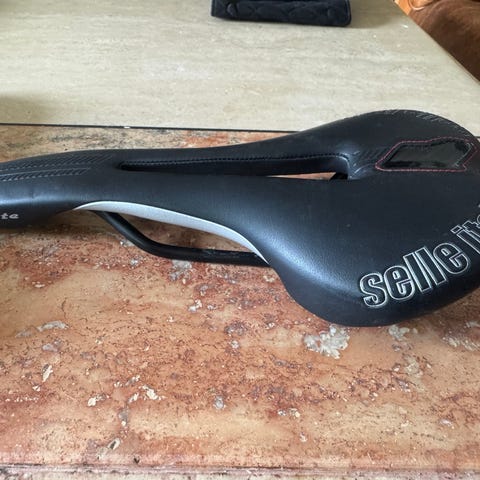 Selle Italia Hööck cykelsadel i sort farve. Sadelens materiale og størrelse er ikke specificeret. Designet til brug på cykler, med broderede detaljer og logoer på overfladen, den her en del patina, men eller ok